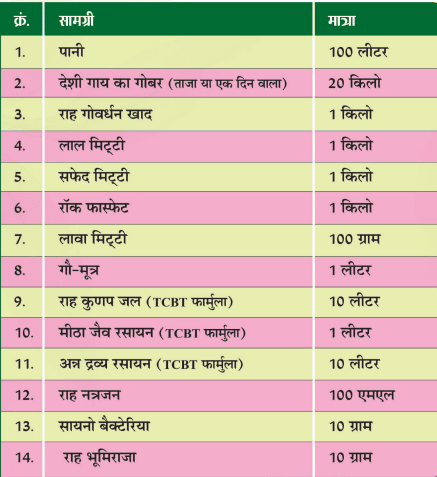 उक्त सबको घोलकर जालीदार कपड़े से ढ़क्कर 11 दिन तक रखें तत्पश्चात सिंचाई के पानी में मिलाकर फसलों की जड़ों में जमीन पर जाने दें। और 20 लीटर उक्त हाई CIN रेशियो घोल को छानकर 200 लीटर पानी में मिलाकर फसलों पर स्प्रे करें।