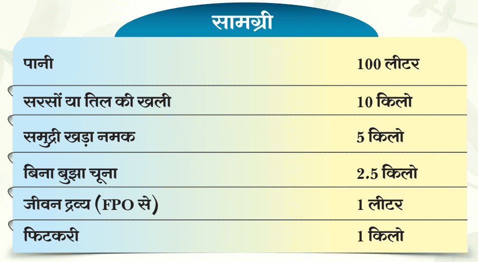सबसे पहले 100 लीटर पानी में 10 किलो खली मिलाएं और उसे 10 मिनट तक फूलने दें। इसके बाद इसमें 2 किलो बिना बुझा चूना डालें और अच्छी तरह घुलने दें। फिर 5 किलो नमक और 1 किलो शुद्ध लाल फिटकरी मिलाएं। अब इसमें 1 लीटर जीवन द्रव्य डालकर अच्छी तरह मिक्स करें। लगभग 8–10 घंटे में यह घोल तैयार हो जाएगा। तैयार होने पर इसे सिंचाई जल के साथ मिलाकर खेत में पौधों की जड़ों के आसपास प्रवाहित करें।