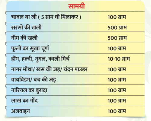 - सभी सामग्री को एक डिब्बे में बंद करके रख दें। गोबर के कंडे को धीरे-धीरे सुगंधित औषधियों के साथ जलाकर उसकी गंध में बदलने की प्रक्रिया को गंध चिकित्सा कहते हैं।