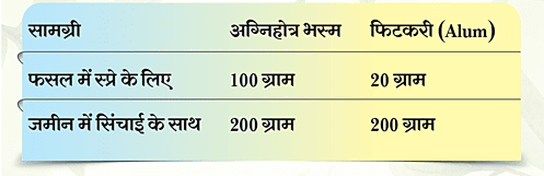- 200 लीटर पानी में 50 ग्राम ऊर्जा भस्म और 200 ग्राम अग्निहोत्र भस्म मिलाएं, मिश्रण को अच्छे से घोलकर छान लें और फसलों पर स्प्रे करें। इसके बाद अगले दिन द्वितीय चरण अपनाएं।
