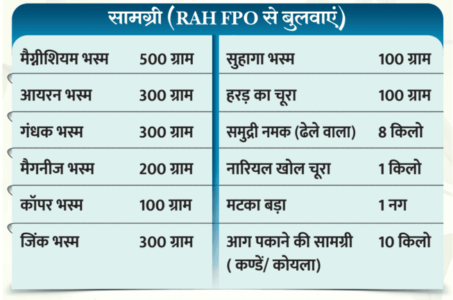 - फिर मटके के आकार का गड्डा खोदना है और गड्ढे में गोबर के सूखे कं डे (उपले) रखना है। फिर मटके को गड्ढे में रखना हैफिर इस मटके के चारो ओर कं डे और लकड़ी रखना और इन कण्डों को जलाना है। ये कं डे थोड़ा जल जाएं तब उसके बीच में धान के भूसे को मिला दें या अन्य चीजों मिला दें । उसके बाद हरे चारे से ऊपर ढ़कना है, ताकि कण्डों की आंच से मिश्रित चीजे पक जाएं । 4 घंटे में खनिज भस्म पककर तयार हो जाता ह।